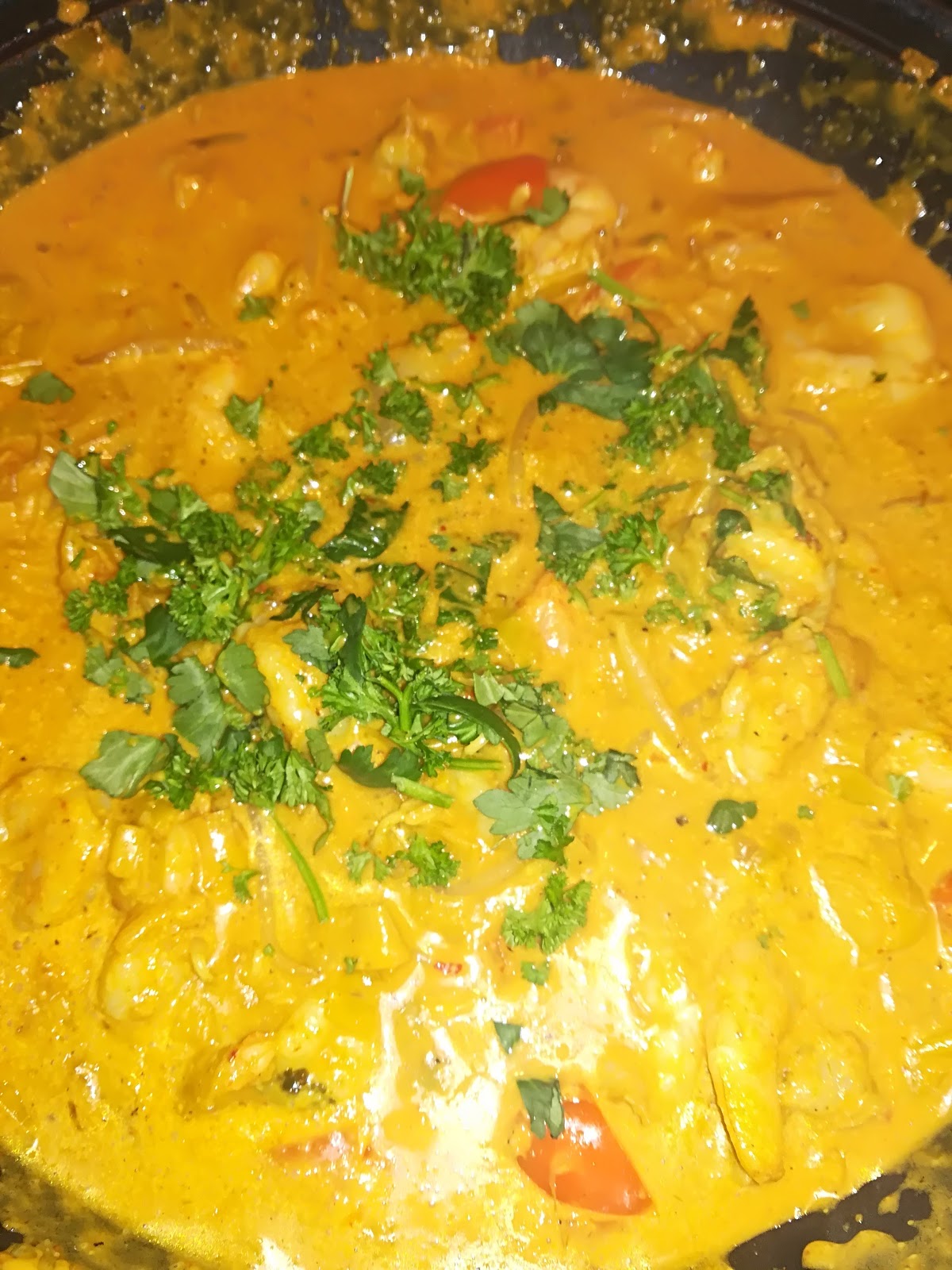 Schenk de kokosmelk en de rode wijn erbij en breng het voorzichtig aan de kook. Laat 10 minuten stoven op laag vuur.