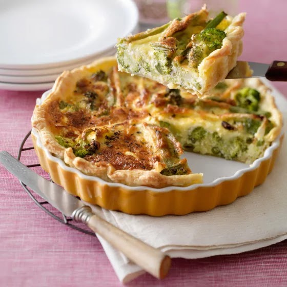 Leg de spekjes en de broccoli in de taartvorm op het deeg en giet het eiermengsel erover heen.