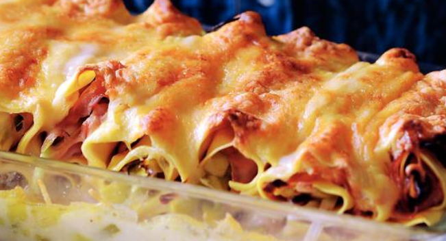 Leg de cannelloni in de overnschaal. Meng de besciamelsaus met de melk en schenk dit over de cannelloni. Bestrooi met de kaas.