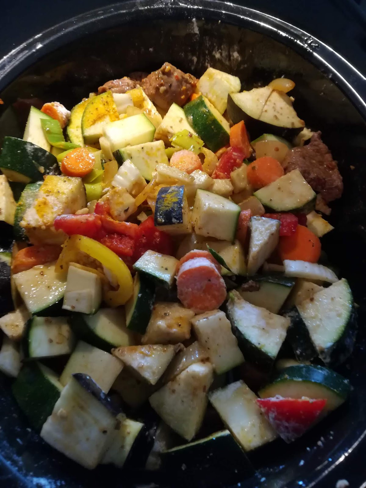 Leg alle groente (ook uit de pan) en het vlees in de slowcooker, voeg 100 ml water, het bouillonblokje, 2 laurierblaadjes en de rest van de wijnazijn toe. Zet de slowcooker 7 uur op stand low.