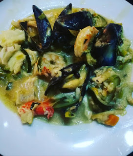 Voeg de currypasta, kokosmelk en het water toe en leg de kabeljauw en scampi’s erin en laat ongeveer een kwartiertje zachtjes pruttelen. Peper en zout naar smaak toevoegen. Voeg de mosselen toe en als deze open gaan is de verrukkelijke viscurry klaar!