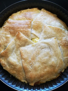 Doe de inhoud van de koekenpan in een taartvorm en verspreidt hierover de spinazie. Strooi de verkruimelde feta erover en breng op smaak met peper en zout. Leg dakpansgewijs de plakjes bladerdeeg erover en druk de zijkanten aan de binnenkant goed aan. (je kunt het bladerdeeg ook samenvoegen en uitrollen tot 1 grote plak deeg). Prik met een vork wat gaatjes in het deeg. Klop het ei los en bestrijk hiermee het deeg. Zet de taart 25-30 minuten in de voorverwarmde oven.