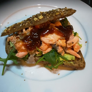 Naar smaak peper en zout toevoegen en op ieder broodje een eetlepel barbecuesaus op de zalm doen.