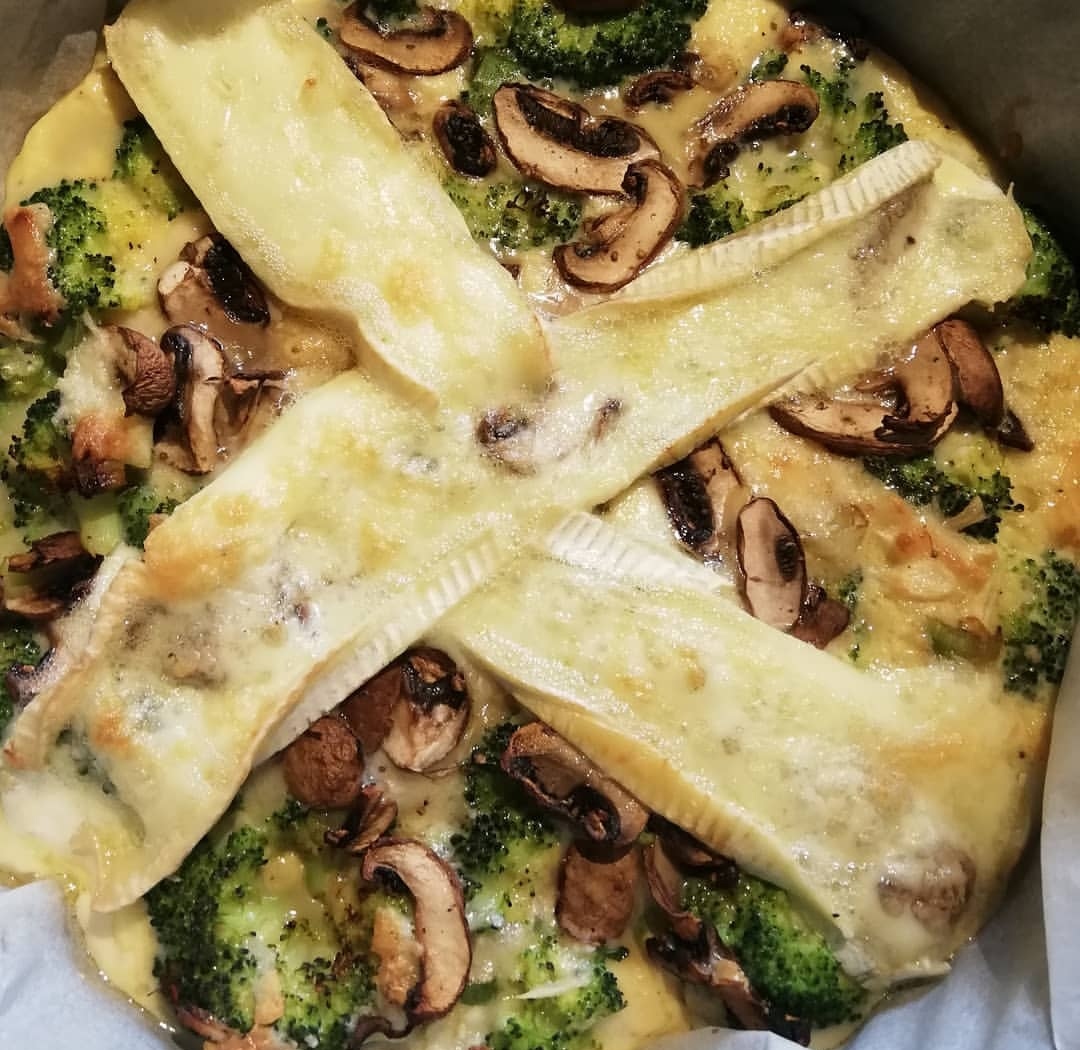 Klop de eieren los met slagroom en roer de geraspte kaas en de gebakken bosui/knoflook erdoor. Snijd de brie in plakken.Leg de broccoli op de bodem van je springvorm, zoveel mogelijk met de bloemen naar boven. Giet dan het ei-kaasmengsel erover en druk de broccoli aan met een vork. Verdeel de plakjes champignon erover en als laatste de plakken brie. Maal er wat zout en peper uit de molen over en bak 20-25 minuten in het midden van de oven gaar en tot de kaas goudbruin kleurt.